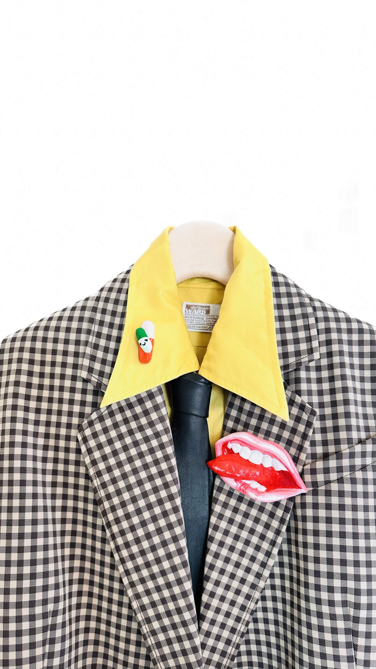 Materials: gold-plated brass hardware; enamel paint on handmade clay