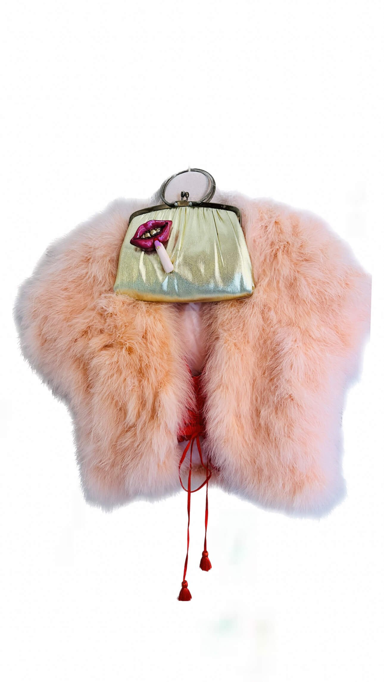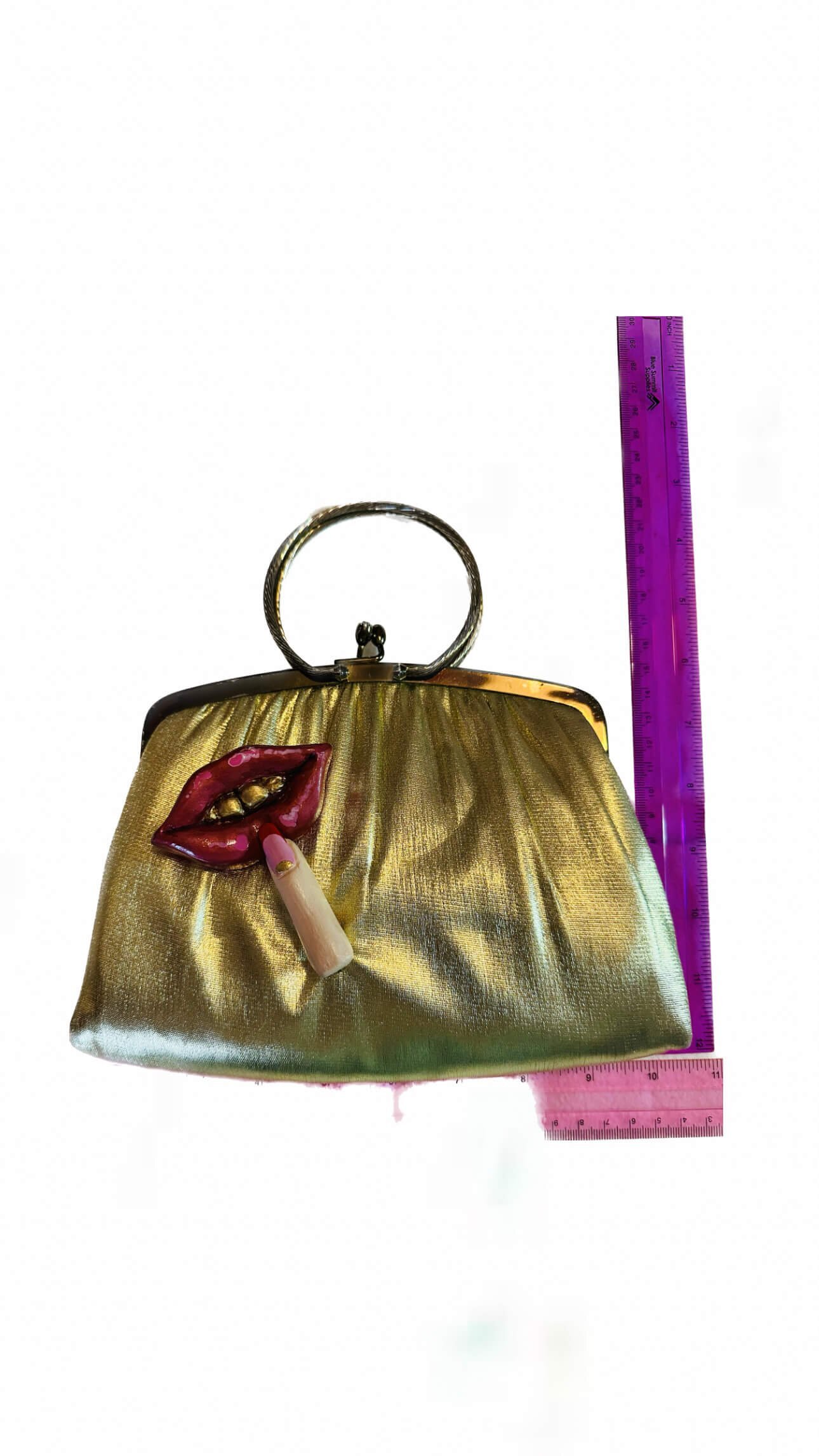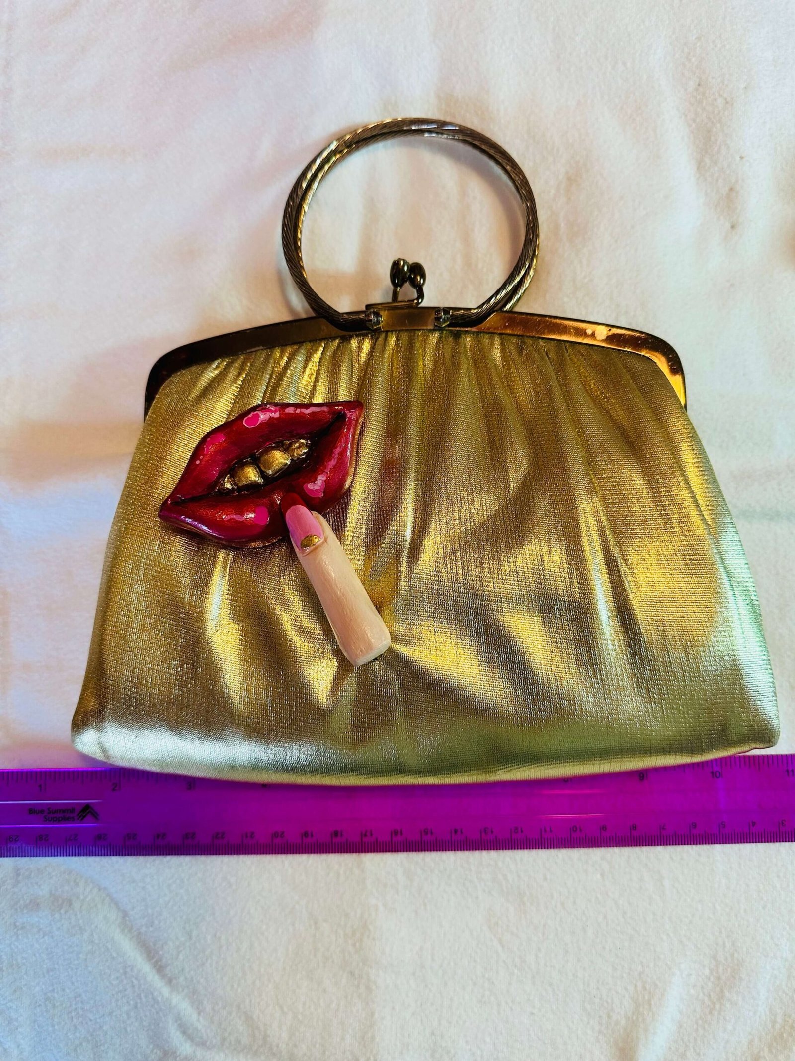 Materials: gold-plated brass hardware; enamel paint on handmade clay; vintage lamé bag