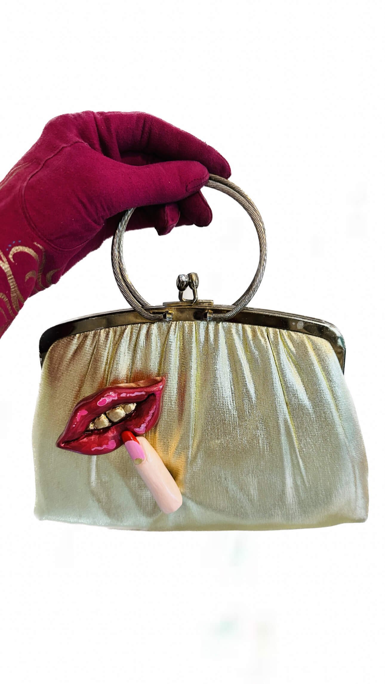 Manicured finger pensively positioned over glossy lips with guilded grille, pinned to vintage lamé evening bag.